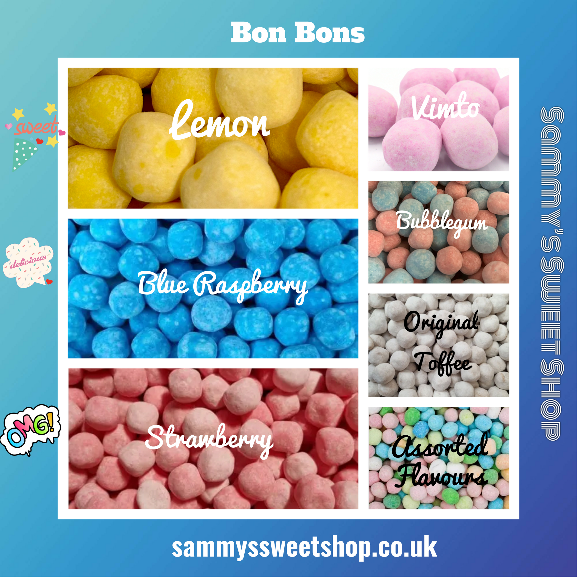Different flavoured chewy Bon Bon’s , we have original retro chewy Toffee, strawberry ,bubblegum, lemon, blue raspberry & Vimto flavours.