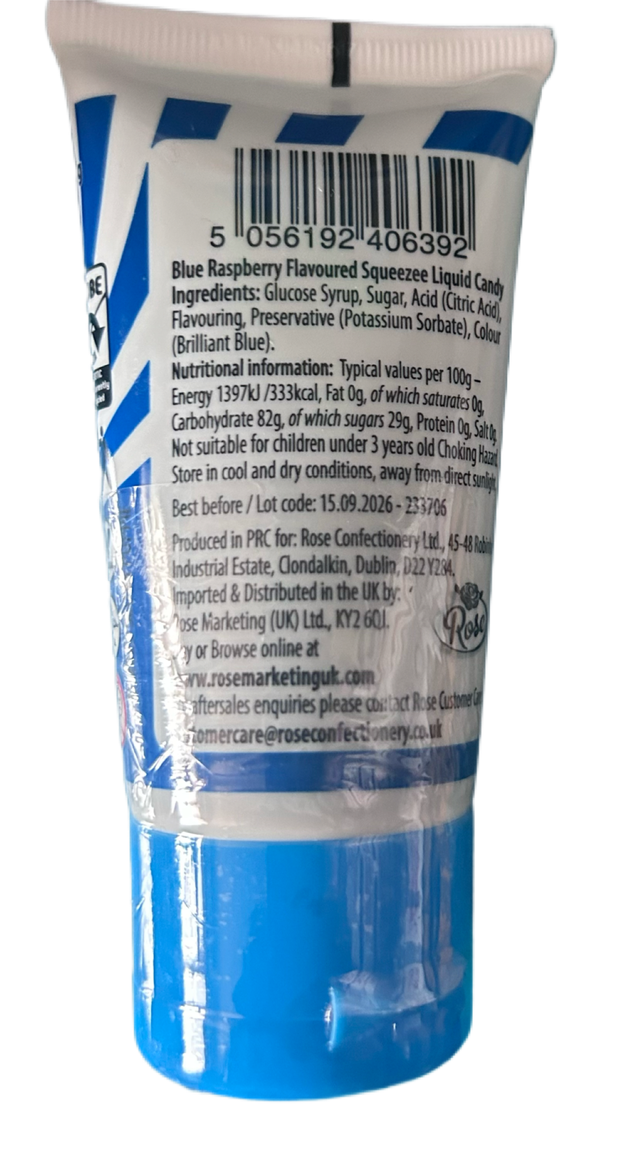 Blue Raspberry Flavoured Squeezee Liquid Candy Ingredients: Glucose Syrup, Sugar, Acid (Citric Acid), Flavouring, Preservative (Potassium Sorbate), Colour (Brilliant Blue.)
