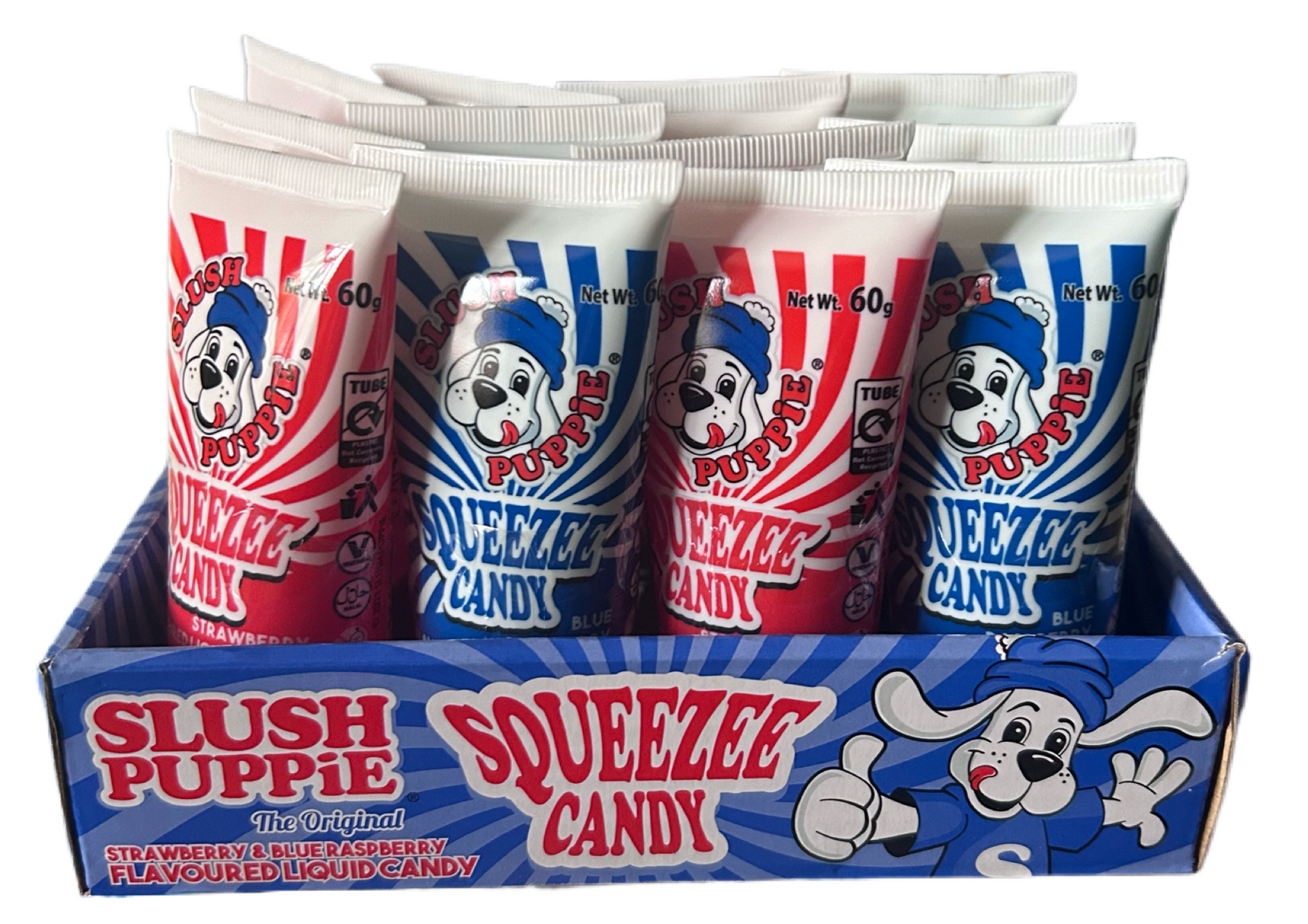 Get a squeeze of fun with our Slush Puppie Squeezee Candy! With both strawberry and blue-raspberry flavors, this 60g tube of liquid candy will satisfy your cravings. Perfect for on-the-go snacking or as a sweet treat, you'll want to squeeze every drop out! (Don't worry, we won't judge if you lick the tube.)