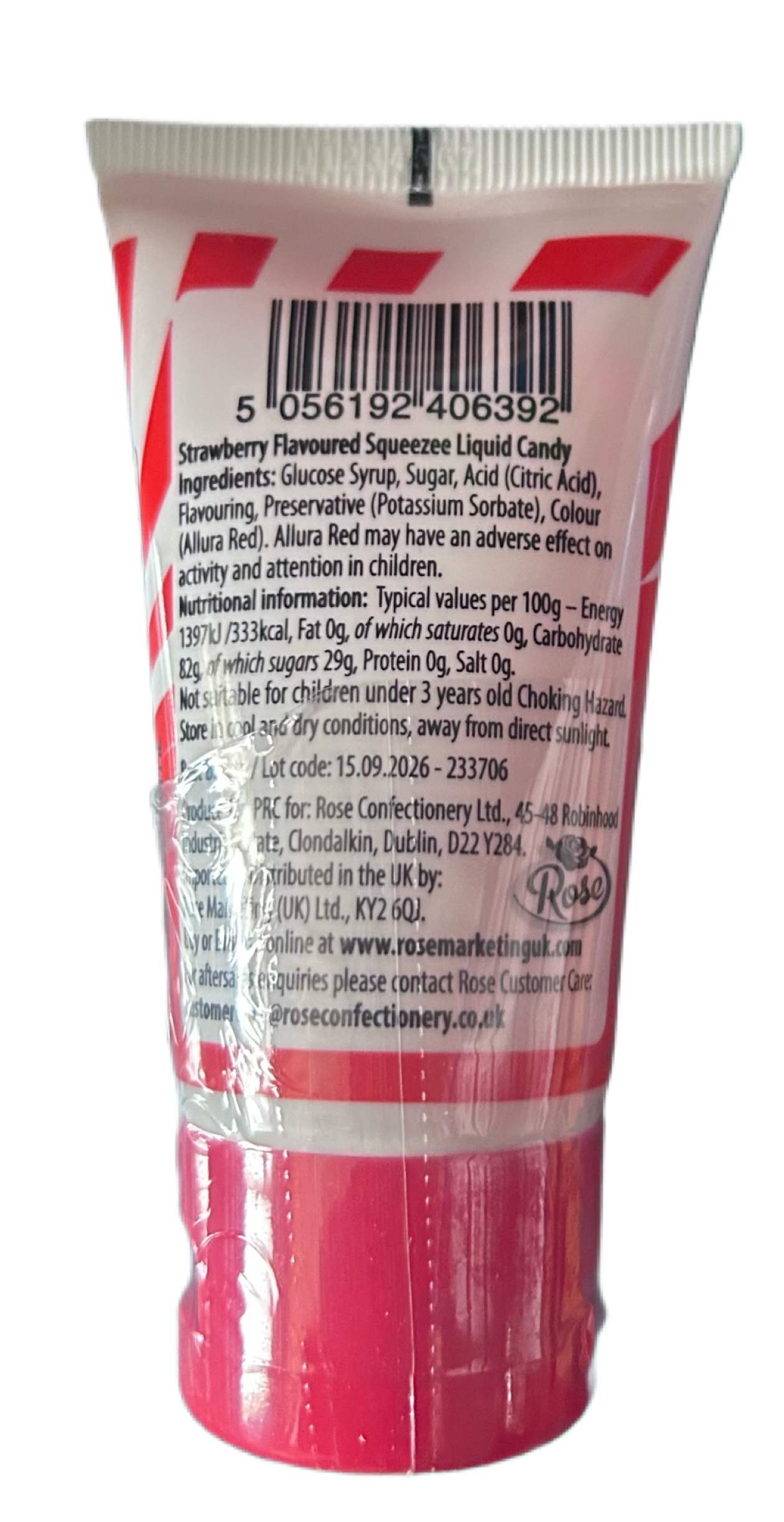 Strawberry Flavoured Squeezee Liquid Candy Ingredients: Glucose Syrup, Sugar, Acid (Citric cid), Flavouring, Preservative (Potassium Sorbate), Colour (Allura Red).