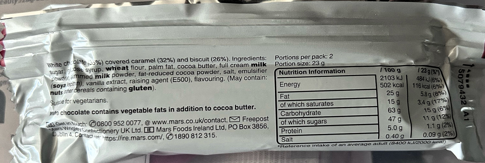 White chocolate 55%) covered caramel (32%) and biscuit (26%). Ingredients: sugar, glucose syrup, wheat flour, palm fat, cocoa butter, full cream milk powder, skimmed milk powder, fat-reduced cocoa powder, salt, emulsifier (soya letithin), vanilla extract, raising agent (E500), flavouring. (May contain: